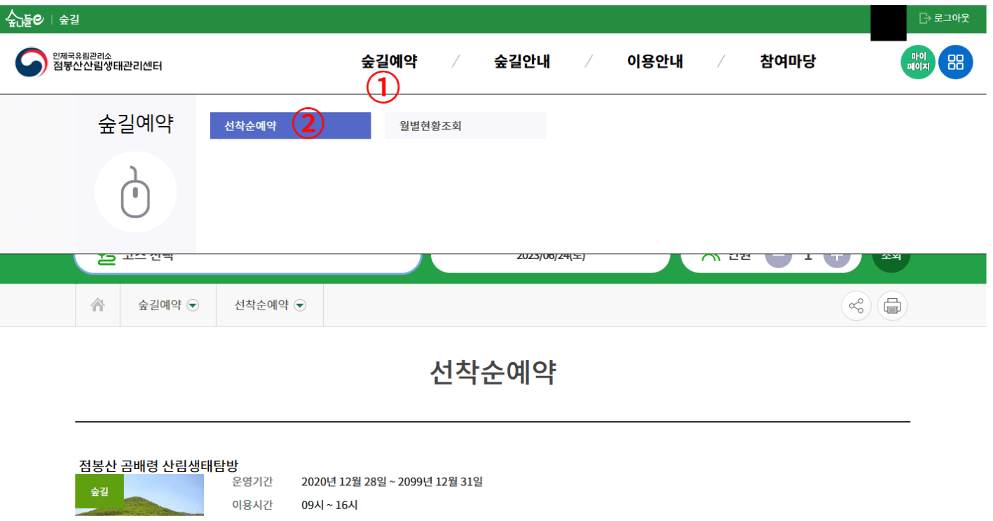 1. 홈페이지(숲나들e) 접속 후 회원가입을 먼저 하시고 회원가입이 완료가 되면 홈페이지 상단에 예약하기를 선택합니다.