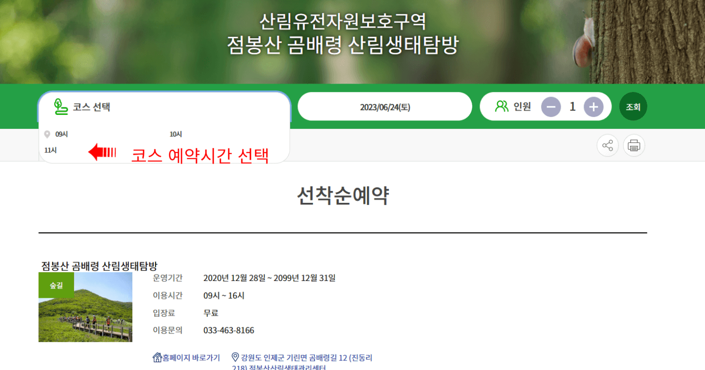 2. 예약버튼을 선택 후 코스 선택을 하는데 코스는 탐방 시작시간을 의미하고 탐방소요시간은 4시간 정도 예상을 하시고 시간계획을 세운 후 코스시간을 선택을 합니다.