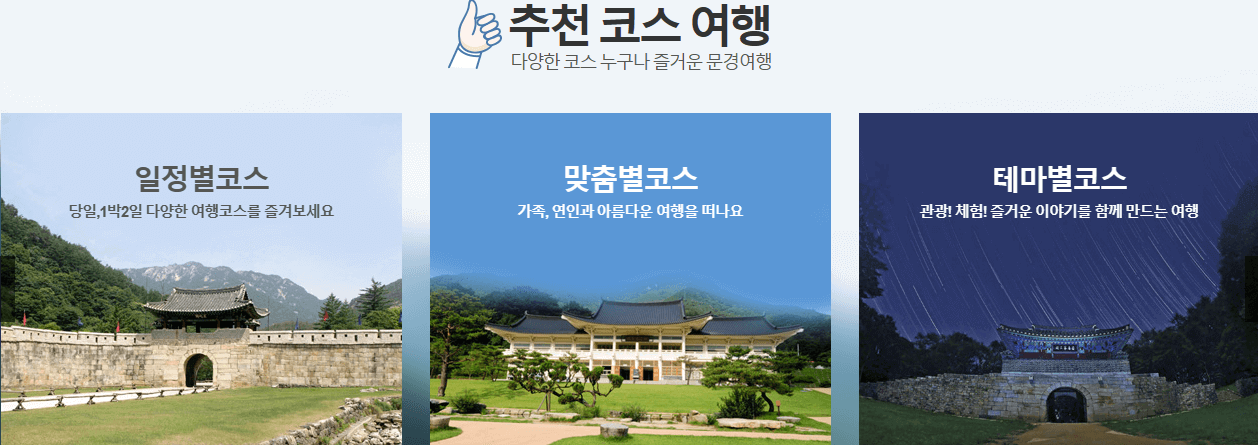 일정별, 맞춤별, 테마별, 권역별, 시설별 추천여행지 코스별로 확인하실 수 있도록 준비해 보았습니다.