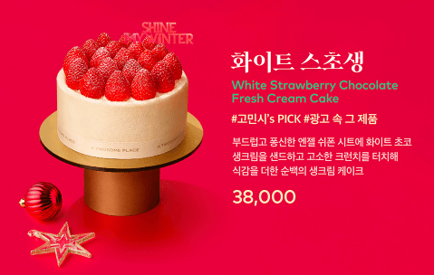 크리스마스의 순백을 연상시키는 부드러운 화이트 초콜릿과 신선한 생크림이 조화를 이루는 클래식한 케이크입니다. - 홀리데이 산타