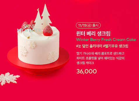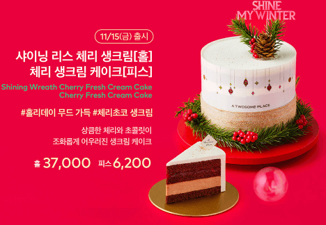 체리와 생크림이 어우러진 맛과 크리스마스 리스 모양의 장식이 특징인 케이크로, 특별한 디저트를 찾는 분들께 추천합니다. - 윈터 베리 생크림