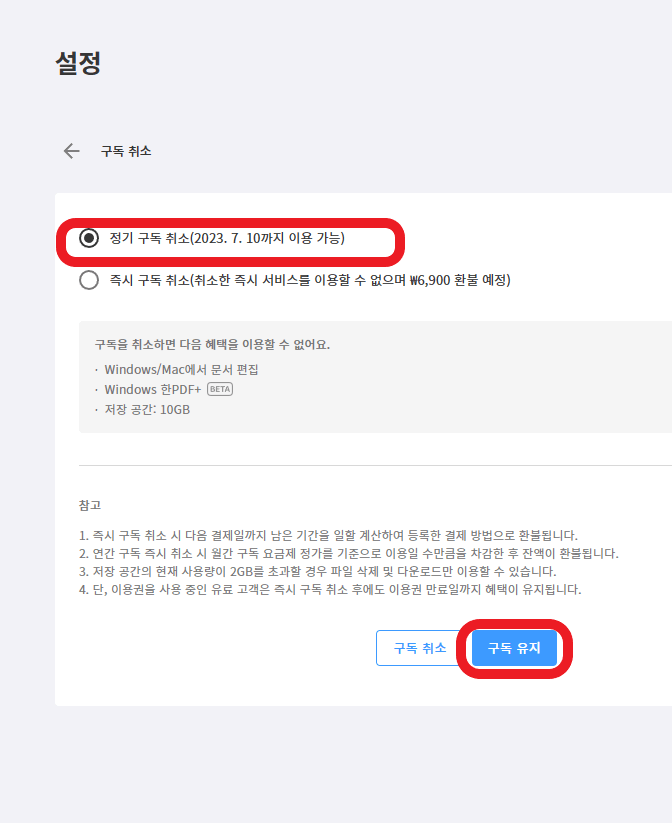 그다음은 정기 구독 취소와 즉시 구독 취소를 할 수 있는 화면이 나옵니다. 정기구독 취소와 즉시 구독 취소의 차이점이 무엇이냐면 정기구독 취소는 예를 들어 6월 1일부터 30일까지 구독결제를 하였는데 다음 달 7월 1일부터는 구독을 할 생각이 없으니 이번달까지만 구독을 하고 다음 달부터는 구독을 하지 않겠습니다.라는 의미입니다.