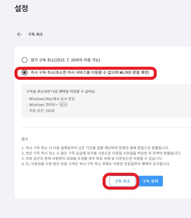 즉시 구독 취소는 현시점을 기준으로 모든 구독 활동을 하지 않겠으니 결제 중이었던 구독료를 환불해 달라는 의미입니다.