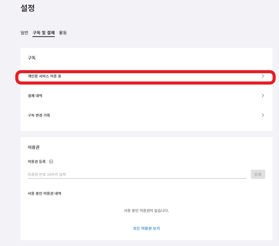 그러면 아래 화면으로 바뀌는데 박스에 있는 개인용 서비스 이용 중을 선택을 하세요