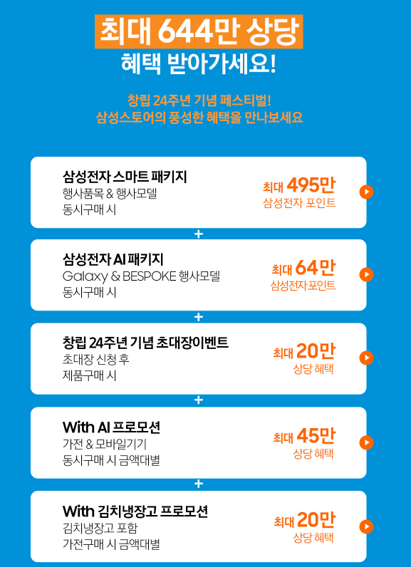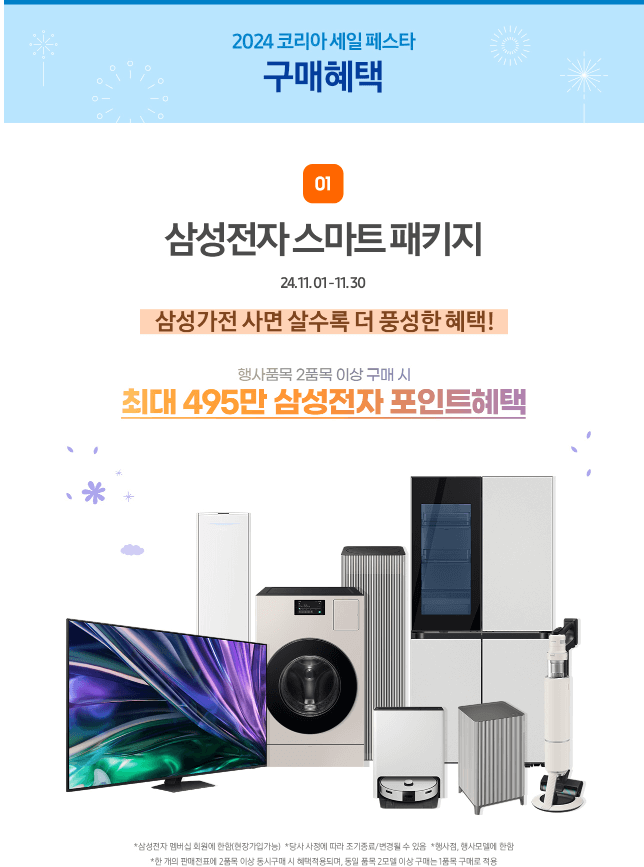 2024 코세페 삼성전자 한정 프로모션은 가전 패키지와 대형 프리미엄 TV, 스마트폰을 포함한 다양한 제품군에 걸쳐 폭넓게 제공됩니다.