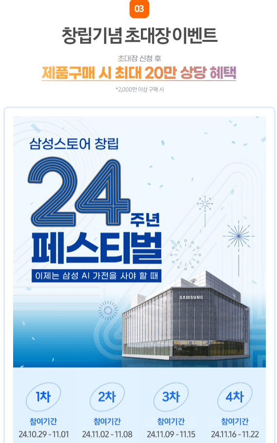 - 추가 할인 및 캐시백: 삼성카드 결제 시 최대 5% 캐시백이 제공되며, 일부 제휴 카드로 20만 원 이상 결제 시 추가 1만 원 할인이 적용됩니다. 💳