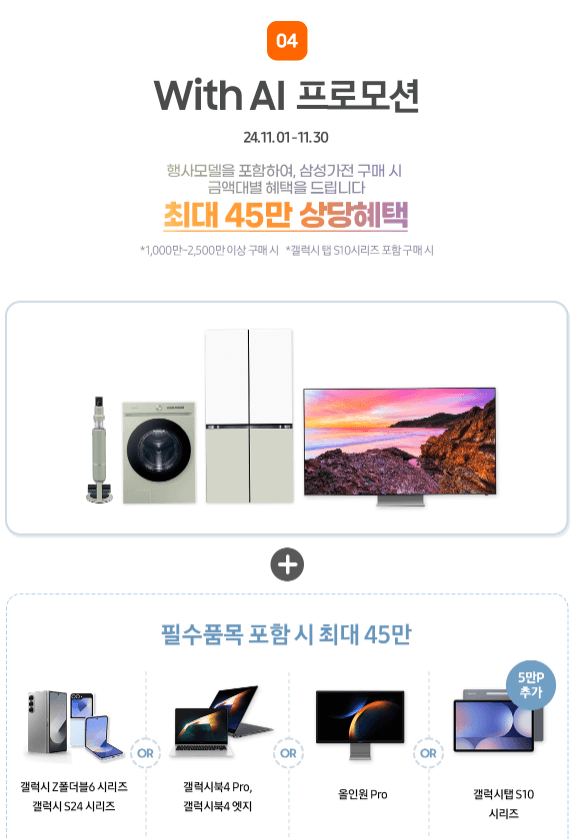 - 사은품: 구매 금액에 따라 전자레인지, 무선청소기 등 삼성의 인기 소형 가전제품이 추가 사은품으로 제공됩니다. 🎁