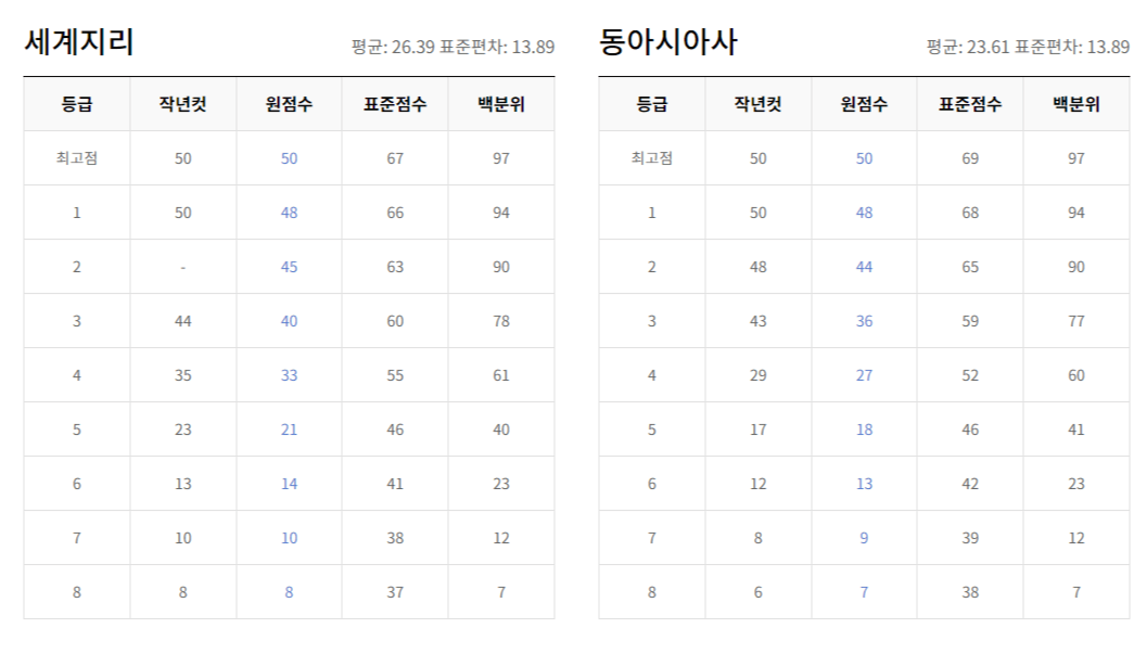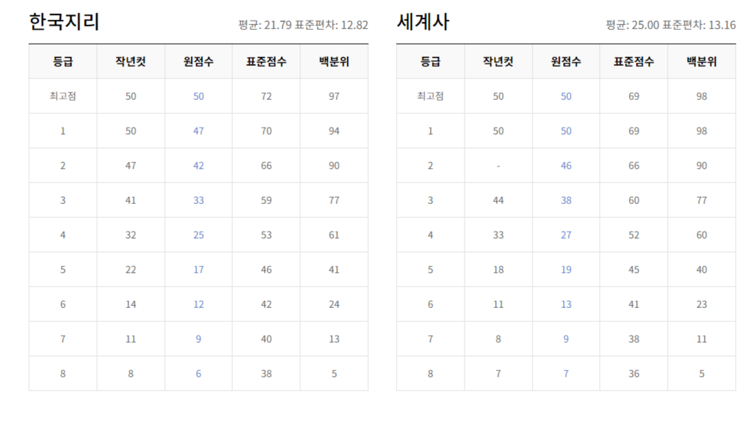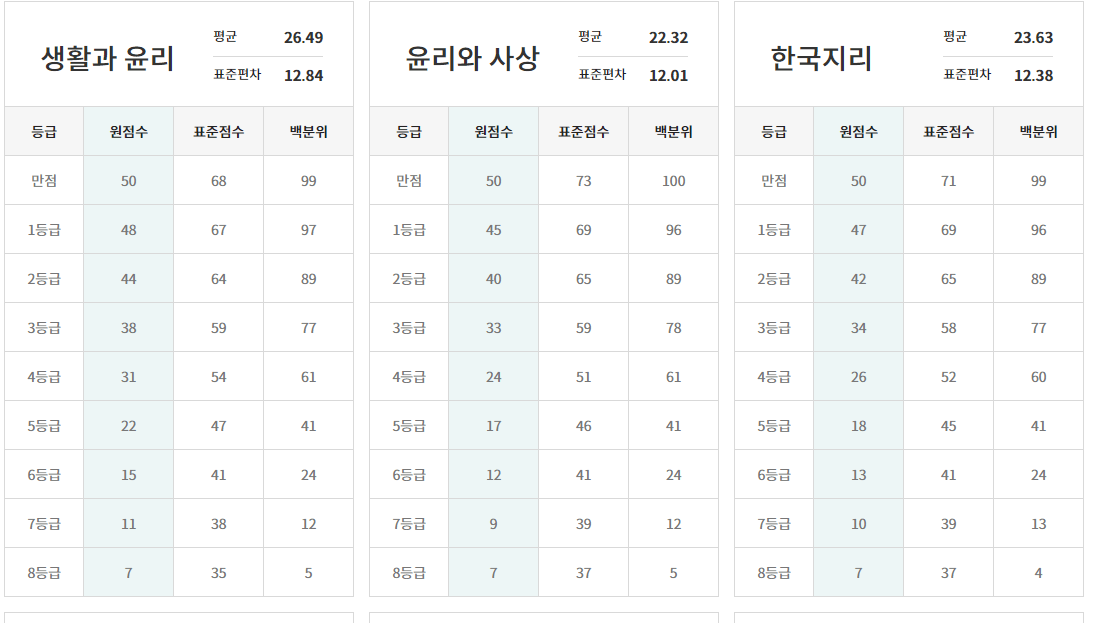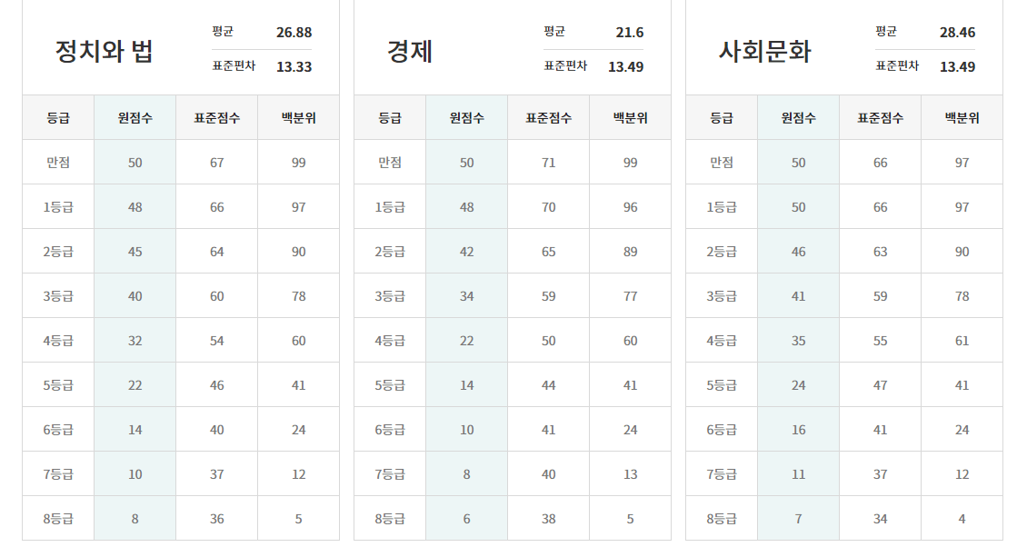 국어, 수학, 한국사, 사회, 과학 등급컷정보는 아래와 같습니다. 시험지 및 정답/ 채점결과 및 실시간 등급컷 등 더 많은 정보를 확인하실 분은 아래를 참고하시기 바랍니다.